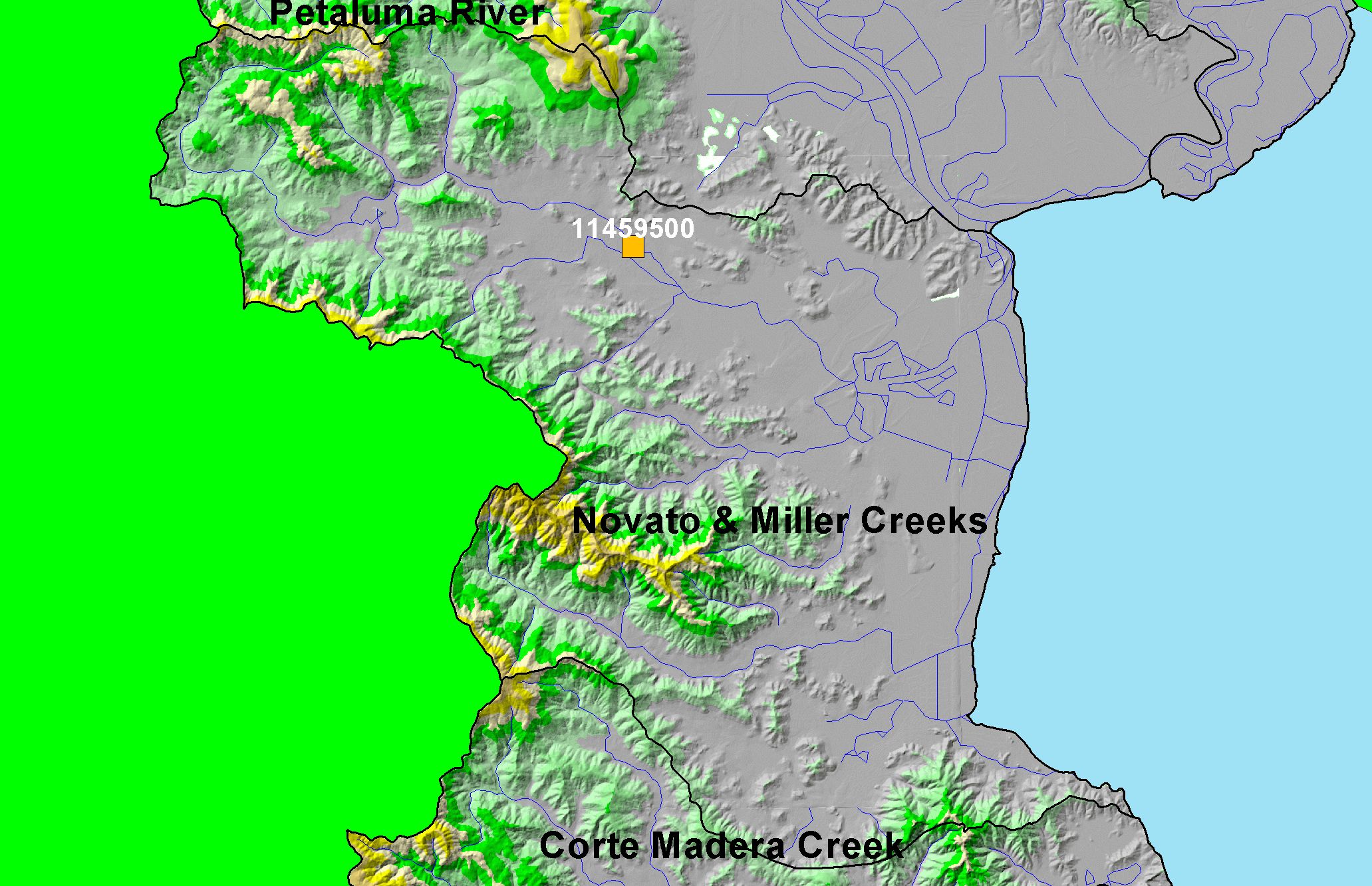 This is a map of streamflow gages in the Novato and Miller Creeks sub-basin. Displayed in the background are KRIS sub-basins, an hillshade of elevation, and