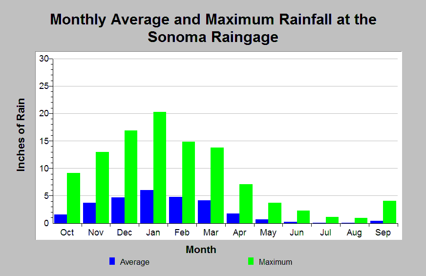 Caption: This chart shows the monthly average and maximum rainfall recorded at the Sonoma raingage (DWR # E20 8351 00). Rainfall is highly seasonal, accumulating the most rainfall between October through April. On average, January is the wettest month (6.0 inches) and July is the driest (0.03 inches). The reported rainfall data are point measurements and do not represent the spatial variations existing throughout the entire Calwater planning watershed. See Info Links for more information.