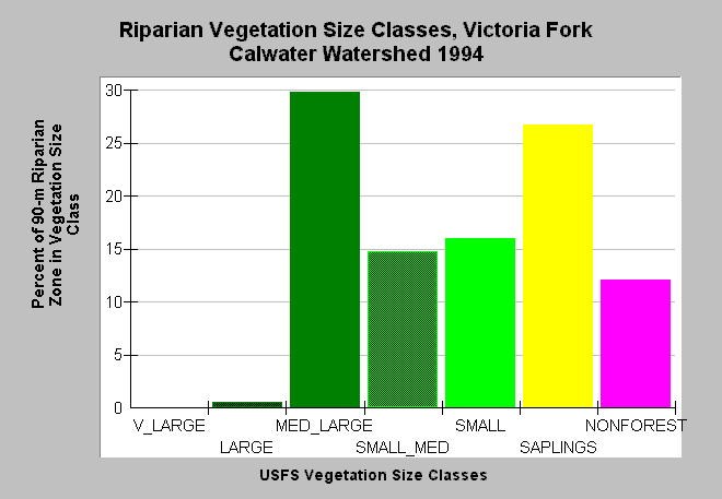 Caption: This bar chart shows vegetation size classes in the riparian zone of the Victoria Fork Calwater Planning Watershed, which is actually the Blue Waterhole Creek basin. The riparian zone encompasses a distance of 90 meters (292.5 feet) on either side of the stream channel. This planning watershed had 30% of the riparian in medium-large and greater trees, 58% in small-medium and smaller trees and 12% in non-forest. The riparian composition is partially influenced by the occurrence of natural grasslands in this basin, but also to a lesser extent timber harvest. The information was derived from a 1994 Landsat image by the U.S. Forest Service. This analysis technique calculates averages of vegetation stands at a one-hectare scale, and therefore is accurate at the stand rather than individual tree level. Click on InfoLinks for more information. Vegetation is classified according to diameter at breast height (DBH): Very Large = 40-50" DBH, Large = 30-39.9" DBH, Medium/Large = 20-29.9" DBH, Small/Medium = 12-19.9" DBH, Small = 5-11.9" DBH, Non-Forest = No trees, shrubs, grass, bare soil.