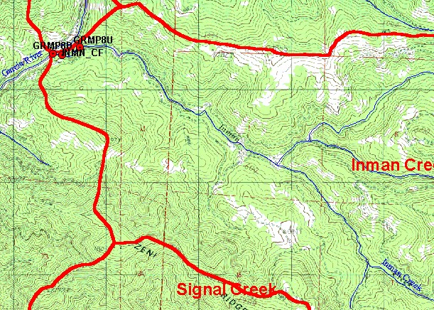 | This map shows some temperature monitoring stations in the Inman Creek sub-basin, overlaid on top of USGS 1:24,000 scale streams, a topographic map, and sub-basins. Temperature sites are color-coded by their floating weekly average temperature (MWAT). Coho are not usually found in streams where MWAT exceeds 16.8 °C (Welsh et. al, 2000). Data were contributed by the California Department of Forestry's Garcia River Instream Monitoring Project and Coastal Forestlands. | |||