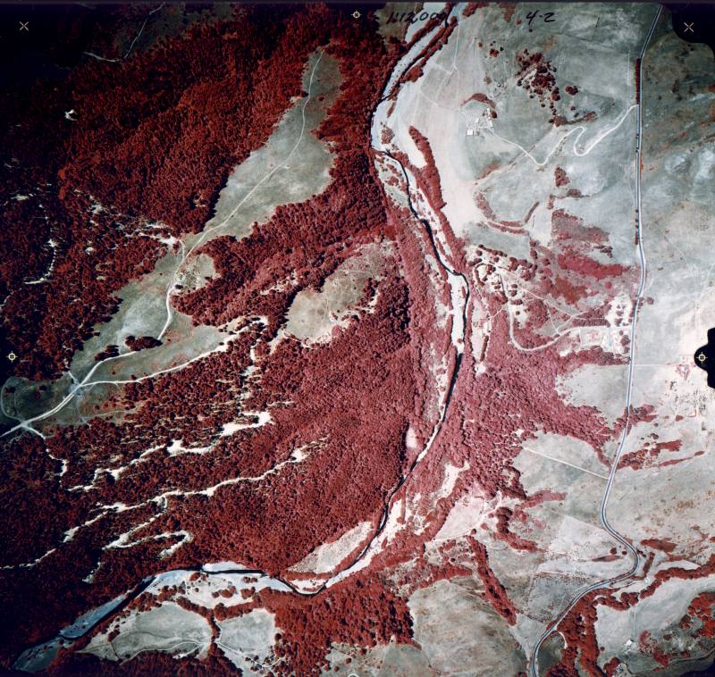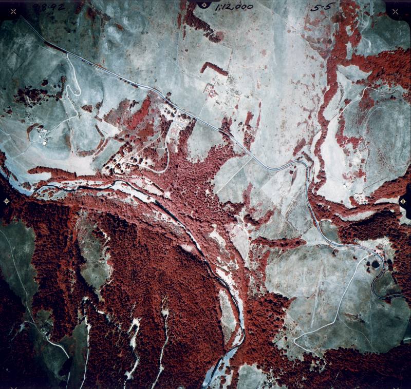 This color aerial infrared photo shows the Garcia River below Highway 1 (top) to above Windy Hollow crossing (bottom). Vegetation is showing typical July patterns with crops showing high growth rates (red) and uplands drying out (gray at left). Photo provided by Peter Dobbins and Friends of the Garcia River. Photo taken in 1992.