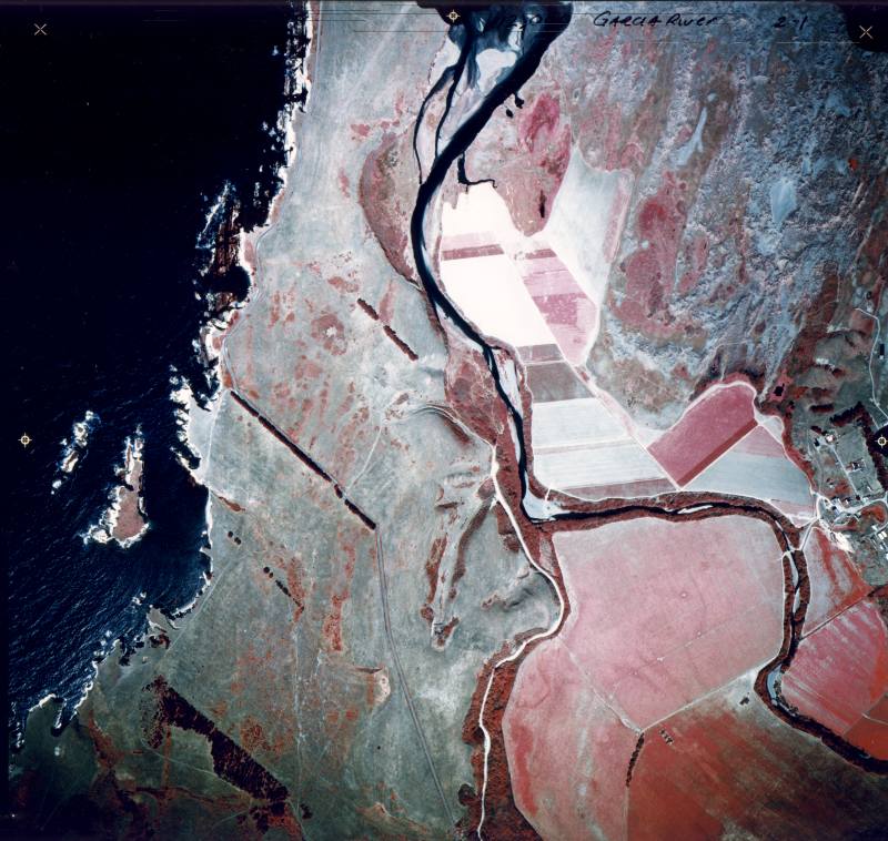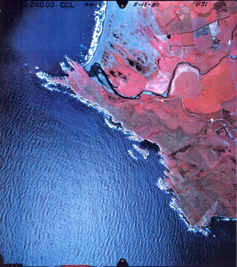 This photo shows the Garcia River estuary from directly overhead in a 1980 infrared aerial photo that also extends south of Pt Arena. This May 17 photo shows vigorous plant growth in red colors, with sand or bare areas (like those north or up in the photo from the mouth of the Garcia). Wetlands and crops both show in red. Note extensive wetlands to the north of the estuary, including standing water which shows as black or dark blue. Photo provided by Peter Dobbins and Friends of the Garcia River.