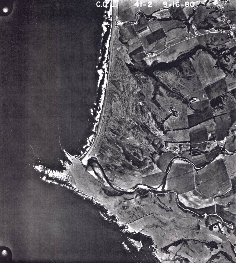 The estuary of the Garcia River in September 1980 is shown as a comparison to Picture #1, although the framing is slightly different. Extensive wetlands near in lower Brush Creek can be seen in this picture to the north of the Garcia estuary. A large lake formed here as a result of the 1906 earthquake to which Brush Creek was joined at the time. This may have been an old Brush Creek stream course along the San Andreas rift which crosses this picture from bottom to top, going offshore at the mouth of Alder Creek. Photo provided by Peter Dobbins and Friends of the Garcia River.