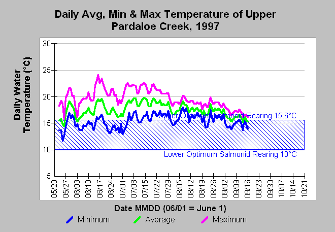 Caption: This Chart shows the daily minimum, maximum, and average water temperature in Celsius (°C) of upper Pardaloe Creek (site PARD_UP) for the year 1997. Water temperatures were often above the optimum range for juvenile salmonids from June through September. The reference value of 10-15.6°C optimum temperature range for juvenile salmonid rearing is based on McCullough (1999). See InfoLinks for more information. Data contributed by the Mendocino County Water Agency.