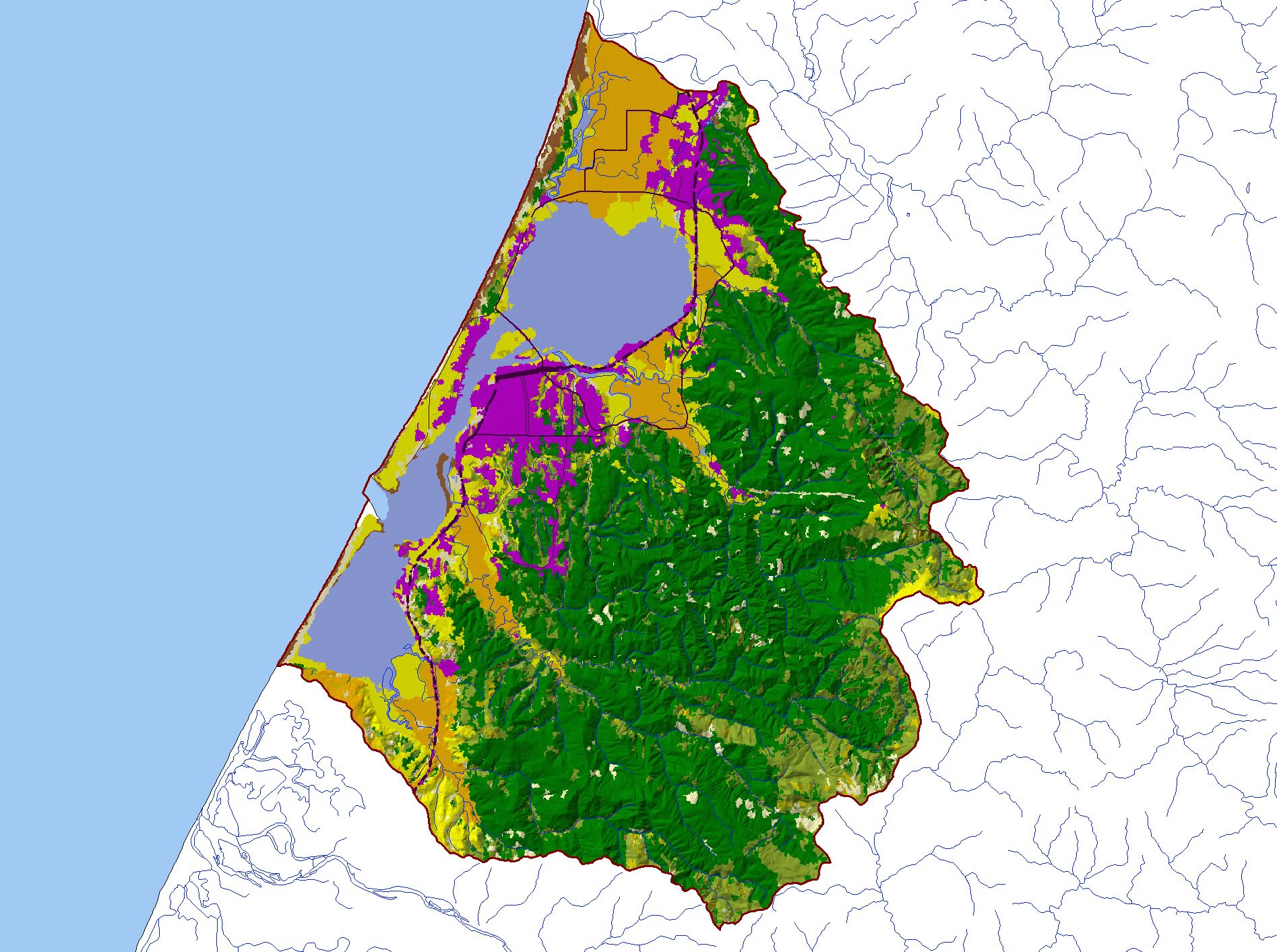 This is a map of 1999 USFS Landsat vegetation type data in the Humboldt Bay Basin. Unlike the vegetation size theme, these data differentiate between hardwoods