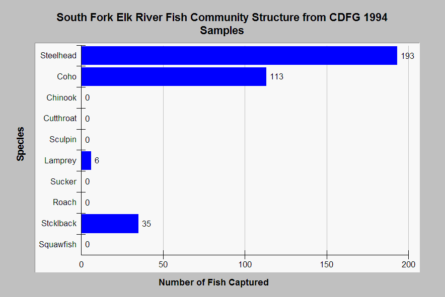Caption: This fish community structure chart shows the results of pooling samples from multiple electrofishing sites in the South Fork Elk River in 1994. The data were collected in conjunction with CDFG habitat surveys and shows a community of predominantly salmonids. Juvenile steelhead dominated the samples, with coho salmon the second most abundant. Pacific lamprey juveniles live in freshwater for several years. Stickleback can exhibit both resident and anadromous life histories.