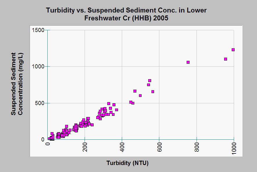 Sediment: Suspended Sed. vs. Turbidity at Lwr Freshwater Cr (HHB) 2005 |