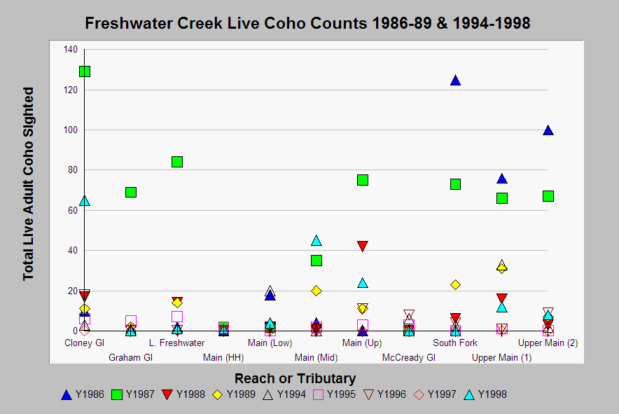 Fish: Coho Live Adult Scatter Plot All Reaches 1986-89, 1994-98 |