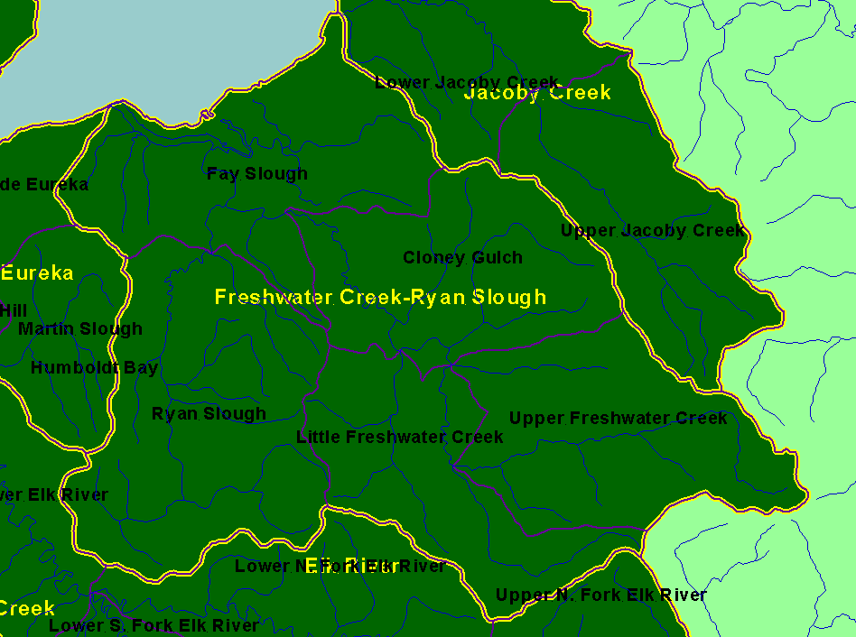 This map shows the Calwater Planning Watersheds within the Freshwater Creek sub-basin, displayed with 1:100k streams and sub-basins. Scale = 1:104,574 .