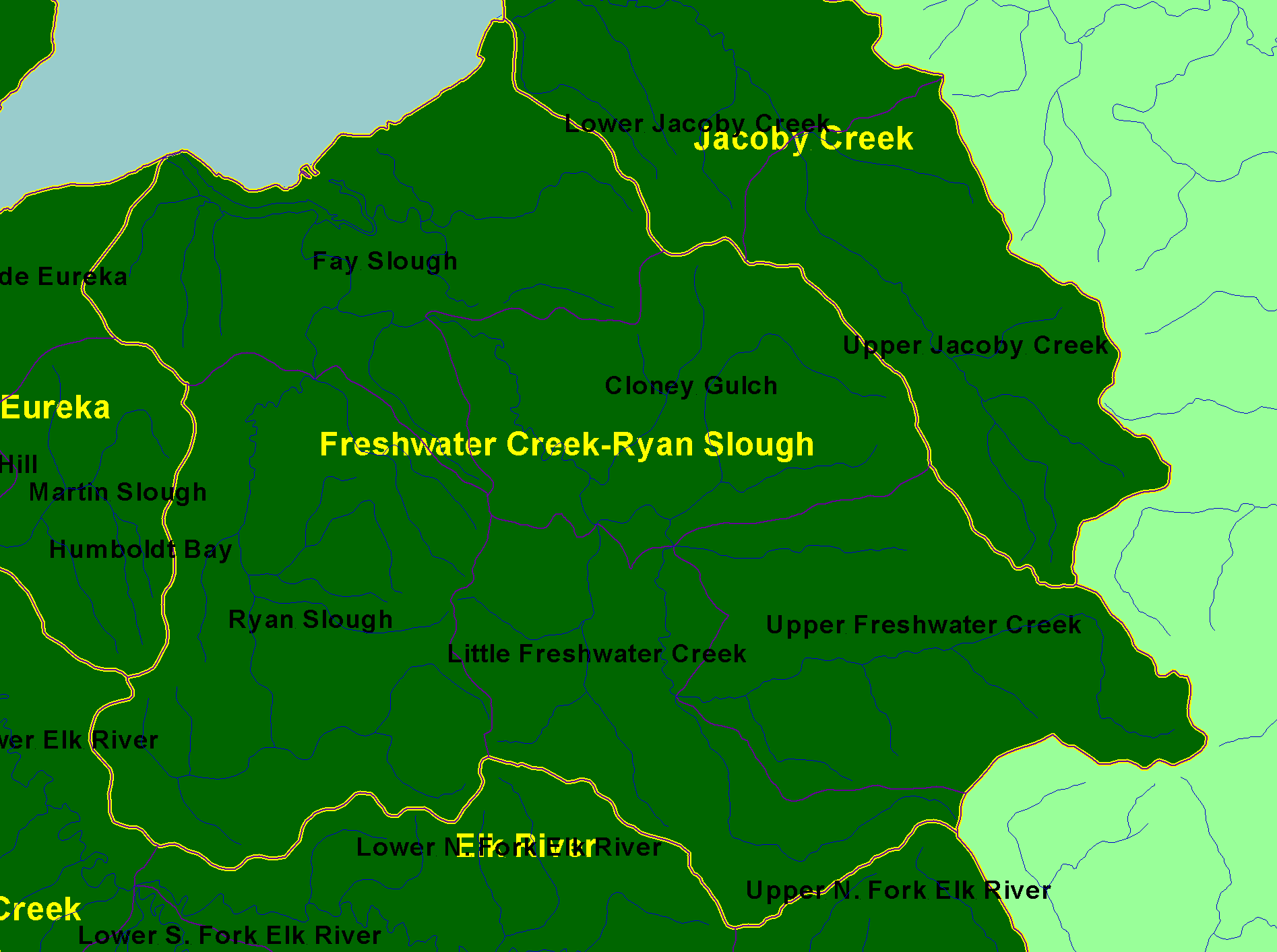 This map shows the Calwater Planning Watersheds within the Freshwater Creek sub-basin, displayed with 1:100k streams and sub-basins. Scale = 1:52,287 .
