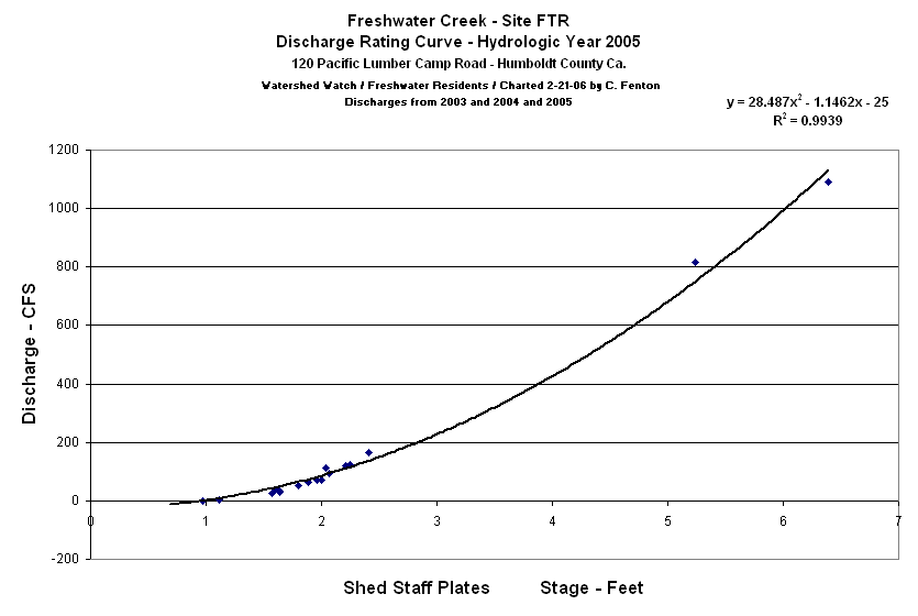 This chart shows the relationship between stage and discharge in middle Freshwater Creek (site FTR) just upstream of Graham Gulch, for hydrologic year 2005. Also shown is the regression equation fit to the data by Salmon Forever. Salmon Forever's Watershed Watch program collected and processed the data.