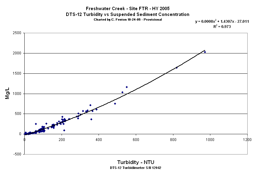 This chart shows the relationship between turbidity and suspended sediment concentration (SSC) in middle Freshwater Creek (site FTR) just upstream of Graham Gulch, for hydrologic year 2005. Also shown is the regression equation fit to the data by Salmon Forever. Salmon Forever's Watershed Watch program collected and processed the data.