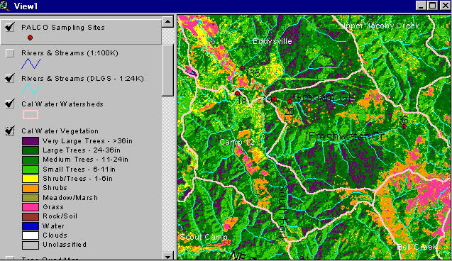 The image above is a classified Landsat 1994 view which shows vegetation type and tree size. Most of upper Freshwater Creek as of 1994 was characterized by large and very large trees and little disturbance from timber harvest had taken place.